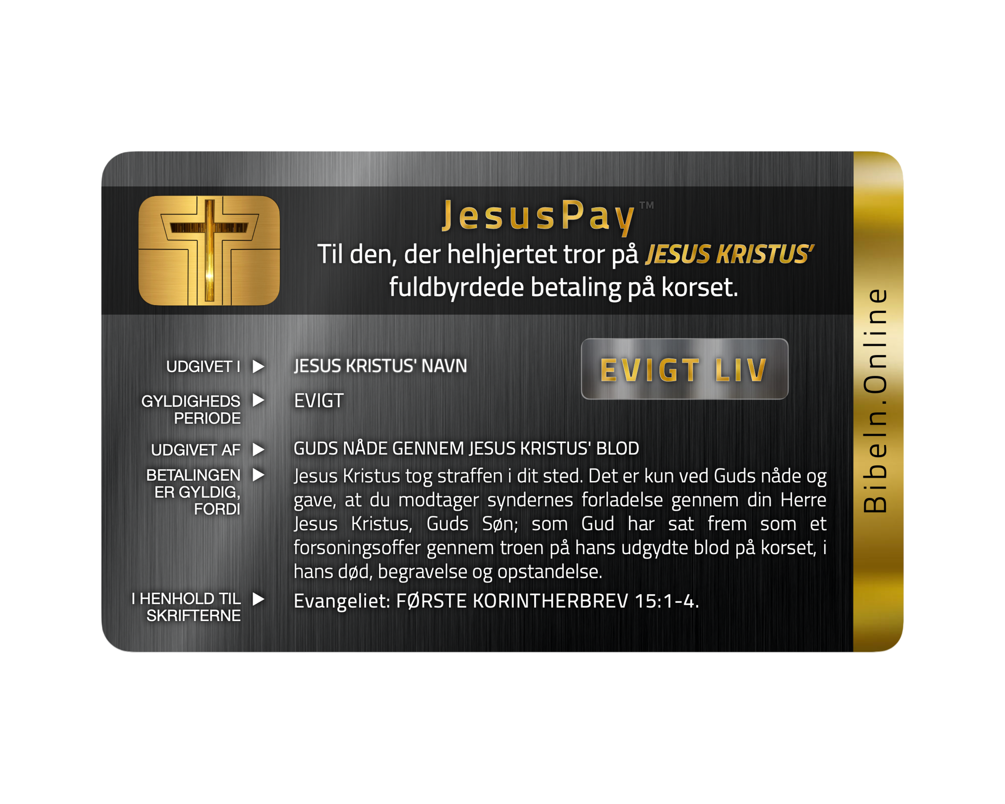 2. JesusPay: Et kort, der allerede er fuldt opladet, ikke med din egen præstation, men med Jesu fuldførte betaling. Når du bruger dette kort, står der på transaktionen: »Fuldt betalt gennem Jesus Kristus.« - Du er gældfri, Amen.